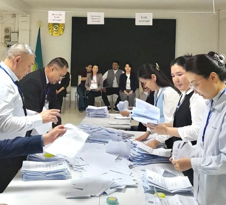 Дауыстарды санау процесін аккредиттеуден өткен байқаушылар бақылап отыр. Дауыстарды санау аяқталғаннан кейін хаттама толтырылады.