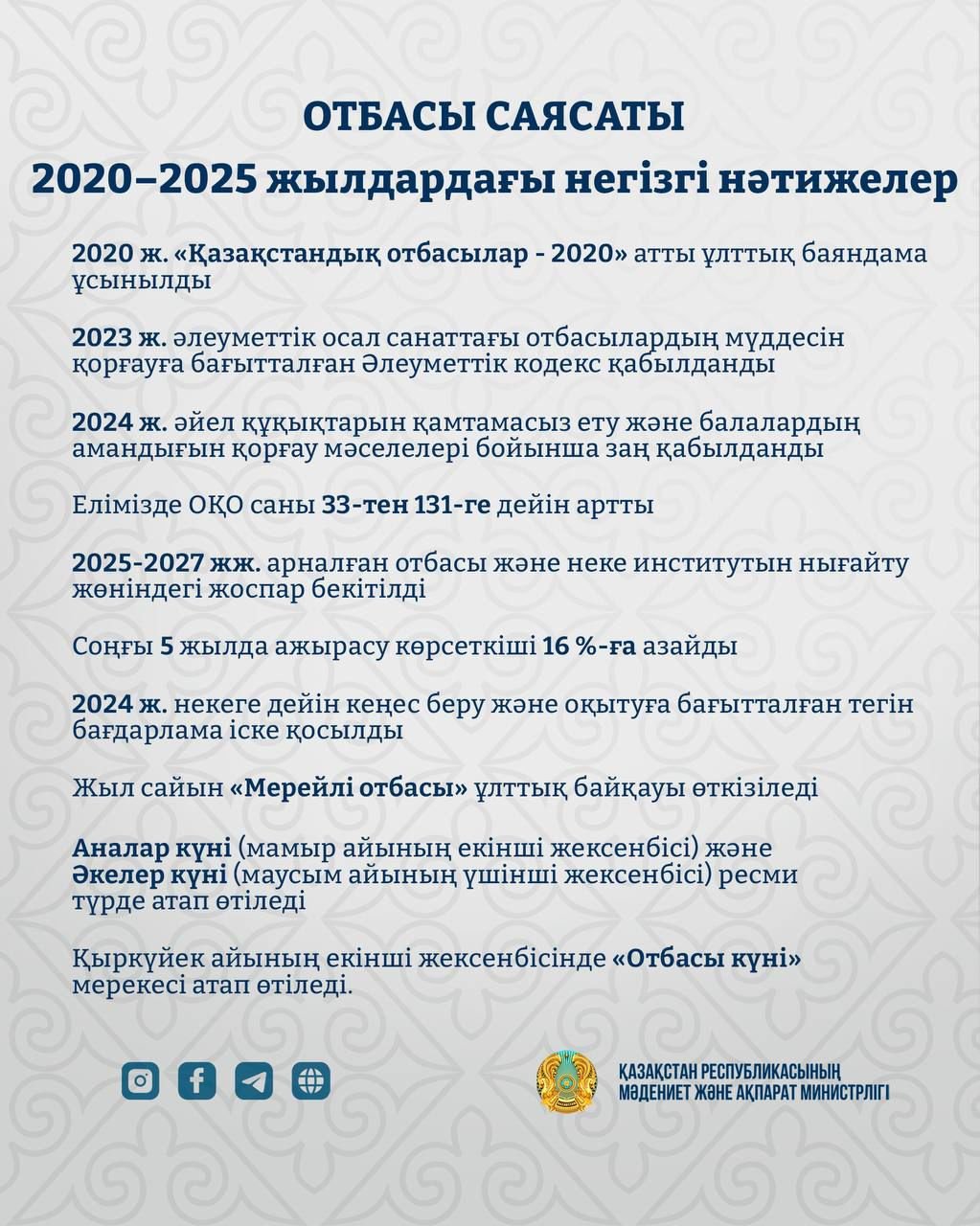 Отбасы мен некені сақтау және нығайтуға арналған 2025-2027 жылдарға арналған іс-шаралар жоспары әзірленіп, бекітілді. Жоспар отбасы өміріне саналы дайындықты арттыруға және ажырасудың алдын алуға бағытталған.