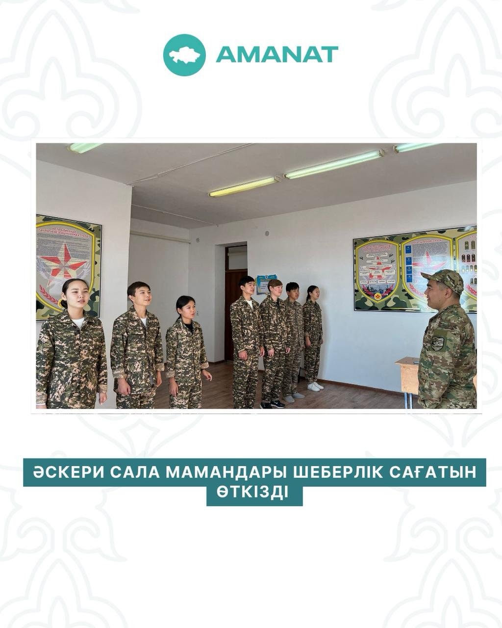 Бүгін “AMANAT” партиясының “QAISAR” әскери-патриоттық жобасы аясында жастарға арналған тағылымды кездесу ұйымдастырылып, әскери сала мамандары арнайы шеберлік сағатын өткізді. Шара ел жастарының бойына патриоттық рух дарытып, Отанға адал қызмет етуге тәрбиелеу, сондай-ақ әскери қызметтің маңызын кеңінен түсіндіру мақсатында өткізілді.