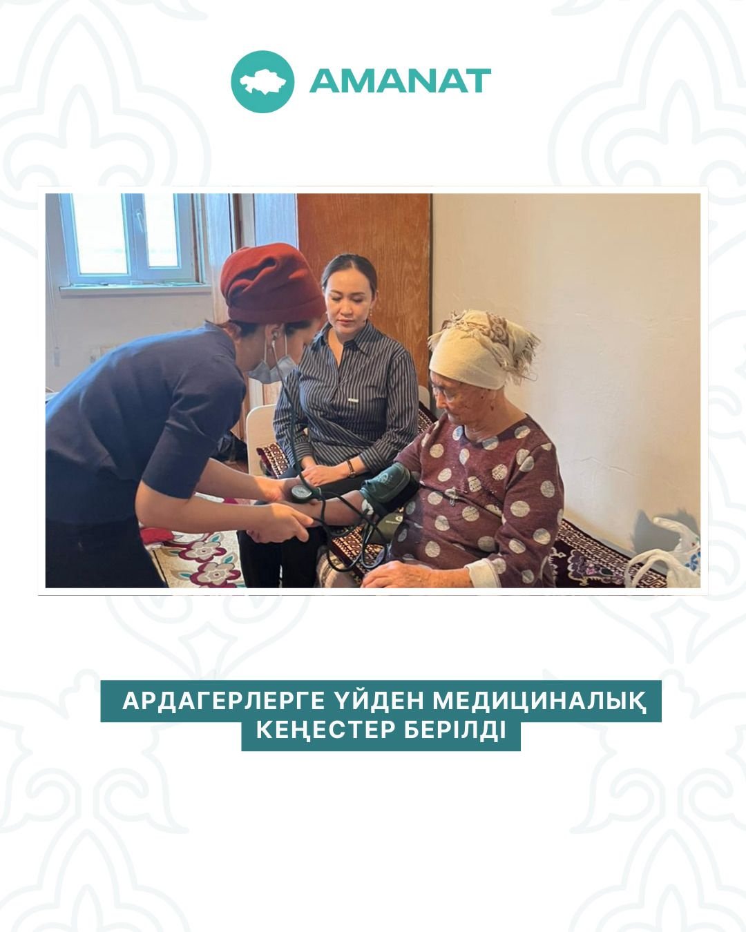 «Ардагерлерді ардақтайық» партиялық жобасы аясында «Аудандық диагностика» бастауыш партия ұйымы аудан аумағындағы бірқатар ардагерлерге үй жағдайында медициналық кеңес беру шарасын ұйымдастырды.Іс-шара барысында медицина қызметкерлері ардагерлердің денсаулық жағдайымен танысып, қан қысымын өлшеу, жалпы медициналық тексеру жүргізу, сондай-ақ күнделікті күтім мен аурулардың алдын алу бойынша түсіндірме жұмыстарын жүргізді. Бұдан бөлек, созылмалы аурулардың алдын алу, дәрі-дәрмектерді қабылдау тәртібі және салауатты өмір салтын ұстану мәселелері бойынша нақты ұсыныстар берілді.