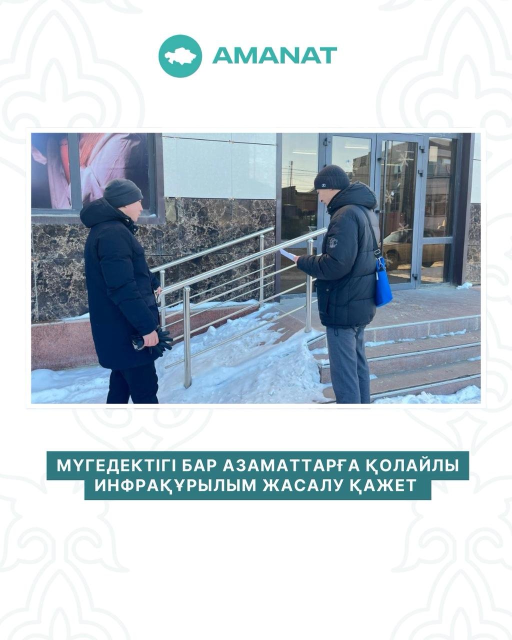 Қоғамда кедергісіз орта қалыптастыру – әлеуметтік әділеттіліктің және адамға деген құрметтің айқын көрінісі. Осы бағытта “AMANAT” партиясы жүзеге асырып келе жатқан “Кедергісіз келешек” партиялық жобасы аясында Арал ауданында кезекті мониторинг жұмыстары жүргізілді.Іс-шараға Арал аудандық жұмыспен қамту және әлеуметтік бағдарламалар бөлімінің маманы Махамбетжан Ержан Нұрлыбекұлы және “AMANAT” партиясы Арал аудандық филиалының консультанты Сабырбай Ержан Әділжанұлы қатысып, қала орталығындағы бірқатар кәсіпкерлік нысандарын аралады. Мониторинг барысында мүгедектігі бар азаматтардың еркін жүріп-тұруына мүмкіндік беретін пандустардың орнатылуы мен олардың қолданыстағы талаптарға сәйкестігі жан-жақты қаралды.