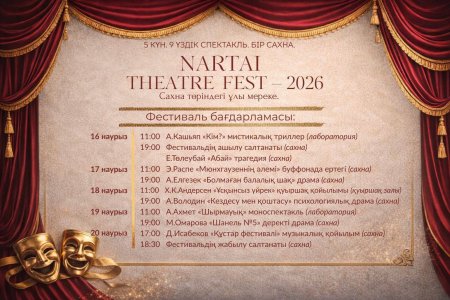 Н.Бекежанов атындағы қазақ академиялық музыкалық драма театрында «Nartai Theatre Fest – 2026» театрішілік фестивалі басталды. Мәдени шараға театр репертуарынан 9 спектакль таңдалып алынды. Фестиваль қорытындысымен қойылым әртістері 9 номинация бойынша марапатталмақ. Бұл туралы Өңірлік коммуникациялар қызметінің театрда өткен кезекті көшпелі баспасөз конференциясында белгілі болды. Оған Қазақстанның еңбек сіңірген қайраткері, режиссер Әмір-Темір Хұсейін Жүсіпұлы, Т.Жүргенов атындағы қазақ ұлттық өнер академиясының профессоры, өнертану докторы Нұрпейіс Бақыт Кәкиқызы, Т.Жүргенов атындағы қазақ ұлттық өнер академиясының профессоры өнертану кандидаты Исламбаева Зухра Усманбекқызы, Жастар театрының көркемдік жетекшісі, режиссер Нұрмаханов