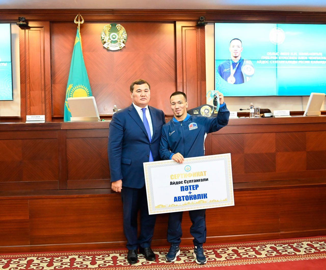 Бүгінгі мерейлі сәтте барша Сыр жұртшылығының атынан Айдос бауырымызға жаңа автокөлік пен пәтер кілттерін, бапкері Ғабиденге де жаңа пәтер беру туралы шешім қабылдадық.