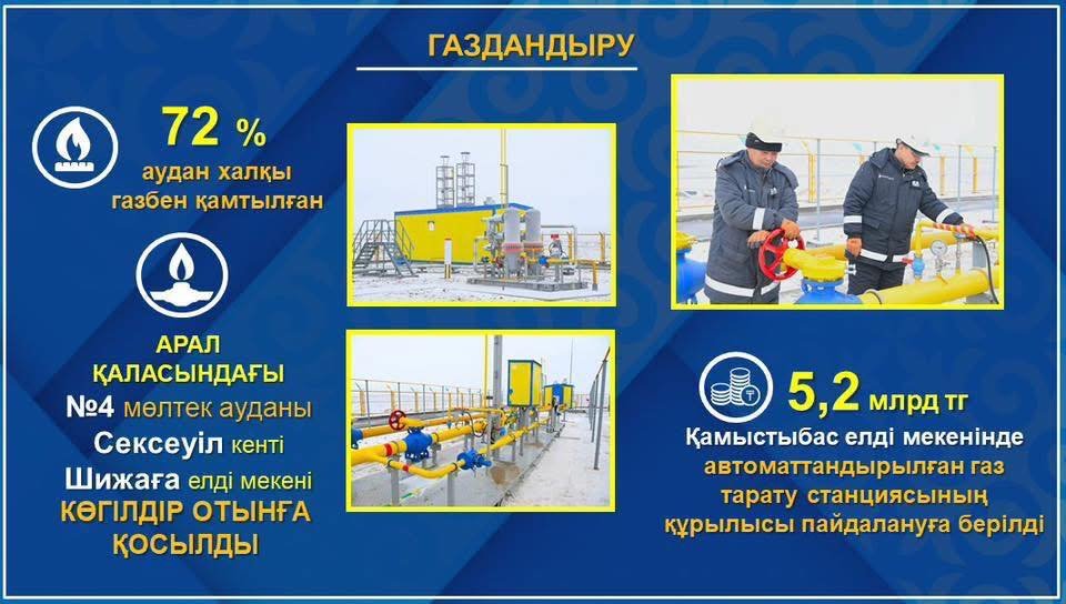 Бүгінде Арал ауданы халқының 72 пайызы көгілдір отынмен қамтамасыз етілген. Алдағы уақытта Арал қаласының бергі бөлігі мен Сыр беткейінде орналасқан 15 мыңнан астам тұрғыны бар 18 елді мекенді кезең-кезеңімен табиғи газға қосу жоспарлануда. Бұл туралы бүгін Өңірлік коммуникациялар қызметінің ақпарат алаңында Арал ауданының әкімі Аманжол Оңғарбаев мәлімдеді.- Мемлекет басшысы Қасым-Жомарт Кемелұлы өз Жолдауында Арал өңіріне қатысты екі маңызды әрі жағымды жаңалықты атап өтті. Оның бірі – Кіші Арал теңізін сақтап қалуға бағытталған нақты шаралар болса, екіншісі – «Сексеуіл – Бейнеу» бағытындағы автомобиль жолының құрылысын жеделдету мәселесі. Қазіргі таңда бұл ауқымды жобаның техникалық-экономикалық негіздемесі әзірленді. Аталған жоба өңір экономикасына серпін беріп, Сексеуіл кенті мен Қосаман, Ақеспе, Ақбасты және Құланды елді мекендеріндегі жол қатынасын жақсартып, тұрғындарды жұмыспен қамтуға және кәсіпкерлікті дамытуға тың мүмкіндік береді, – деді аудан әкімі.