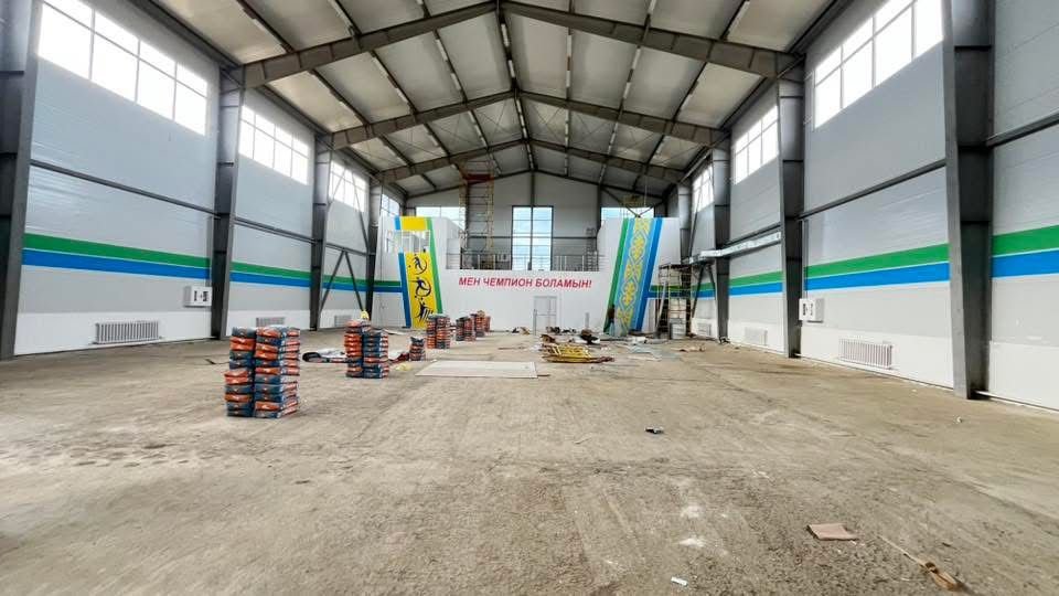 Бүгінгі күні құрылыс алаңында ауқымды жұмыстар атқарылып, ішкі әрлеу жұмыстары жалғасып, еденді құю және спорттық линолеум төсеуге дайындық жүргізілуде.
