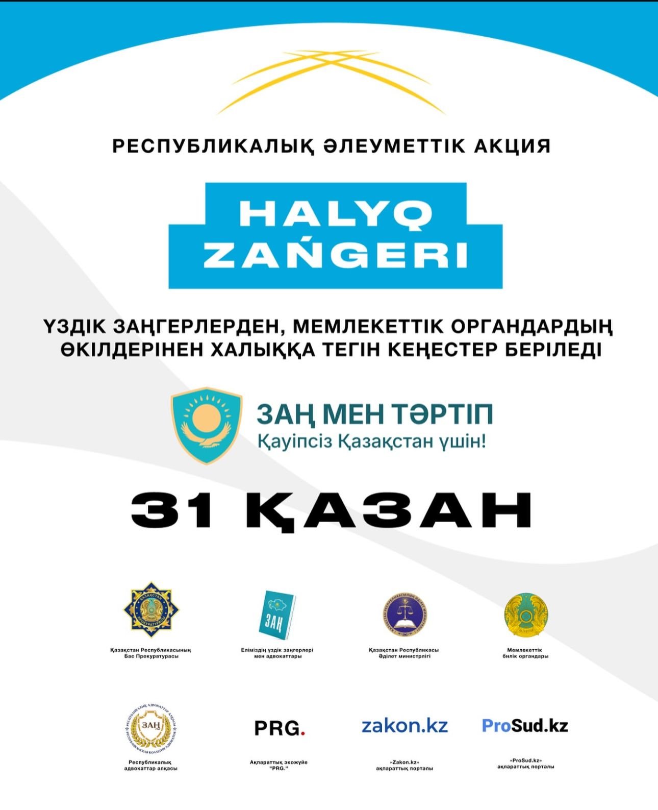 2025 жылы 31 қазан Қазақстан Республикасының барлық қалаларында «Халық заңгері» ауқымды жалпыреспубликалық акциясы бір мезгілде өтеді!Заңгерлер, адвокаттар мен мемлекеттік орган өкілдері Сіздердің барлық сұрақтарыңызға жауап беріп, білікті ұсыныстар айтып, Сіздерге заң тұрғысынан көмектесетін болады.