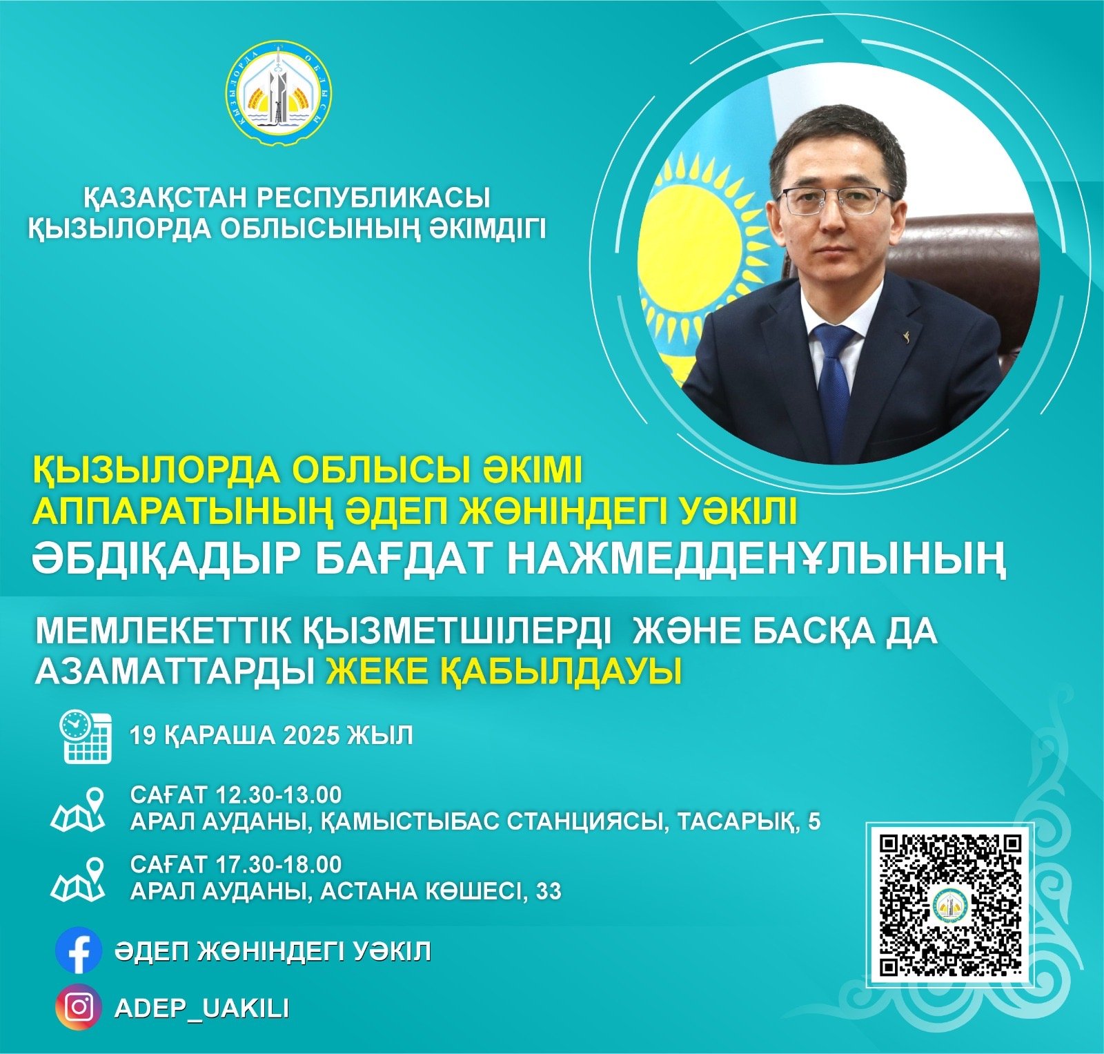АРАЛ АУДАНЫ ТҰРҒЫНДАРЫНЫҢ НАЗАРЫНА! Қызылорда облысы әкімі аппаратының Әдеп жөніндегі уәкілі Б.Әбдіқадыр 2025 жылғы 19 қарашакүні сағат 12.30-13.00 аралығында «Қамбаш» олимпиадалар және қосымша білім беру орталығы ғимаратында және сағат 17.30-18.00 аралығында Арал ауданы әкімдігінің ғимаратында Қазақстан Республикасының мемлекеттік қызметі мен сыбайласжемқорлыққа қарсы іс-қимыл заңнамаларының және Қазақстан Республикасы мемлекеттік қызметшілерінің әдеп кодексі нормаларының сақталуы мәселелеріне қатысты жеке қабылдау жүргізеді.