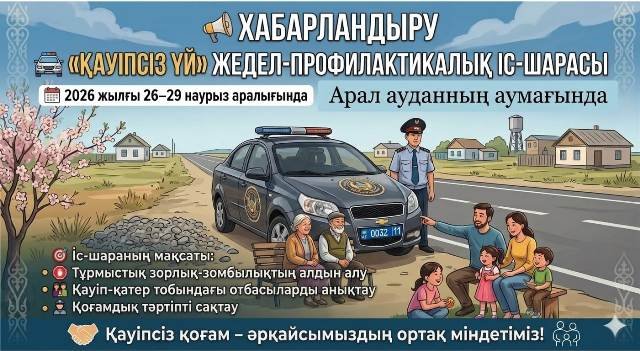 Ағымдағы жылдың наурыз айының 26–29 аралығында Арал ауданы Полиция бөлімімен «Қауіпсіз үй» тақырыбында іс-шара өткізілуде. Аталған іс-шараның негізгі мақсаты – тұрғындар арасында тұрмыстық қауіпсіздік ережелерін кеңінен насихаттау, құқық бұзушылықтың алдын алу және қауіпсіз өмір салтын қалыптастыру.Іс-шара барысында полиция қызметкерлері тұрғындармен және жасөспірімдермен кездесулер өткізіп, қауіпсіздік талаптарын түсіндіруде. Атап айтқанда, үйдегі өрт қауіпсіздігі, электр құралдарын дұрыс пайдалану, балалардың қараусыз қалмауы сияқты маңызды мәселелерге ерекше назар аударылуда. Сонымен қатар, құқықтық сауаттылықты арттыру мақсатында түсіндірме жұмыстары жүргізіліп, тұрғындарға пайдалы кеңестер берілуде.Шара аясында балаларға арналған танымдық кездесулер ұйымдастырылып, оларды сақтыққа, жауапкершілікке тәрбиелеу көзделуде. Осындай іс-шаралар өскелең ұрпақтың қауіпсіздік мәдениетін қалыптастыруға зор ықпал етеді.